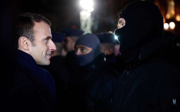 Ακολούθησε η ανάκρουση του γαλλικού εθνικού ύμνου στην πλατεία και έπειτα ο Μακρόν χαιρέτισε αξιωματούχους και αστυνομικούς.