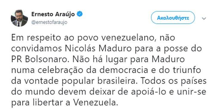 «Σε ένδειξη σεβασμού προς τον λαό της Βενεζουέλας, δεν προσκαλέσαμε τον Νικολάς Μαδούρο στην ορκωμοσία του προέδρου Μπολσονάρου», την 1η Ιανουαρίου, ανέφερε ο Αραούζο μέσω Twitter.