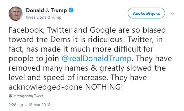 «Το Facebook, το Twitter και η Google είναι τόσο προκατειλημμένοι υπέρ των Δημοκρατικών, είναι γελοίο. Το Twitter, πράγματι, το κάνει πολύ πιο δύσκολο για τον κόσμο να ακολουθήσει το @realDonaldTrump. Έχουν απομακρύνει πολλά ονόματα & έχουν επιβραδύνει σε μεγάλο βαθμό το επίπεδο και την ταχύτητα με την οποία αυξάνονται (οι ακόλουθοι). Έχουν παραδεχθεί ότι δεν έκαναν ΤΙΠΟΤΑ!».