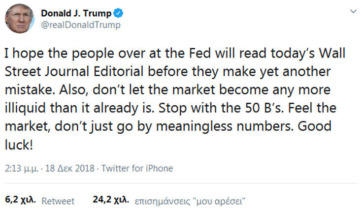 «Ελπίζω πως οι άνθρωποι της Fed θα διαβάσουν το σημερινό κύριο άρθρο της Wall Street Journal προτού κάνουν ένα ακόμη λάθος», έγραψε σε ένα tweet ο Αμερικανός πρόεδρος. «Αισθανθείτε την αγορά, μην παίρνετε τις αποφάσεις σας απλώς και μόνο με βάση ασήμαντους αριθμούς», πρόσθεσε.