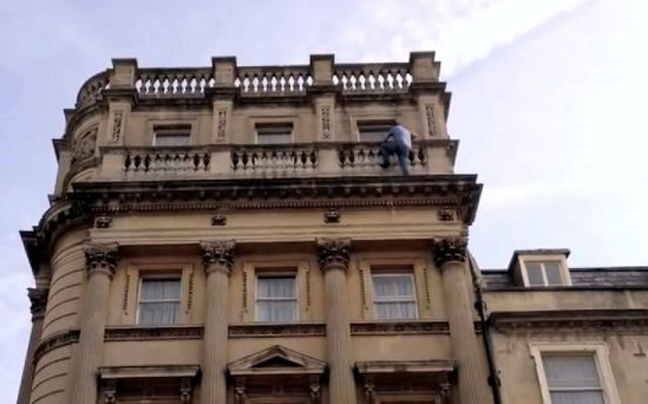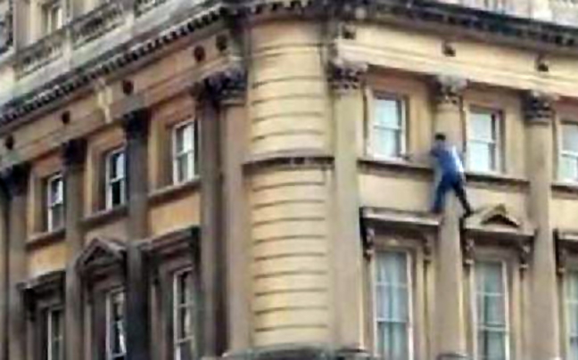 Μοιάζει σαν ο φωτογράφος να έπιασε έναν κλέφτη εν δράσει ή έναν εραστή που το σκάει όπως όπως από το παράθυρο. Ωστόσο πρόκειται για έναν καθαριστή τζαμιών στη Βρετανία που αγνοεί κάθε κανόνα και μέτρο ασφαλείας.
