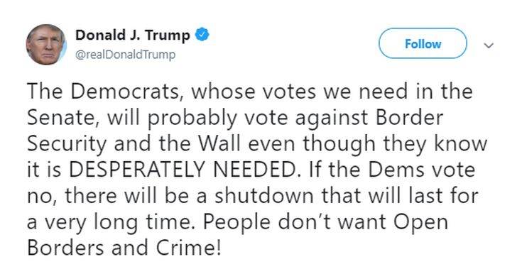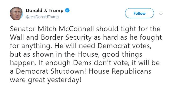 Εάν δεν ψηφίσουν αρκετοί Δημοκρατικοί, θα είναι μια αναστολή λειτουργίας λόγω των Δημοκρατικών. Οι Ρεπουμπλικάνοι της Βουλής ήταν υπέροχοι χθες!», έγραψε ο Τραμπ σε ανάρτησή του στο Twitter, μία ημέρα αφού η αμερικανική Βουλή των Αντιπροσώπων ενέκρινε τα κονδύλια για τα σύνορα.