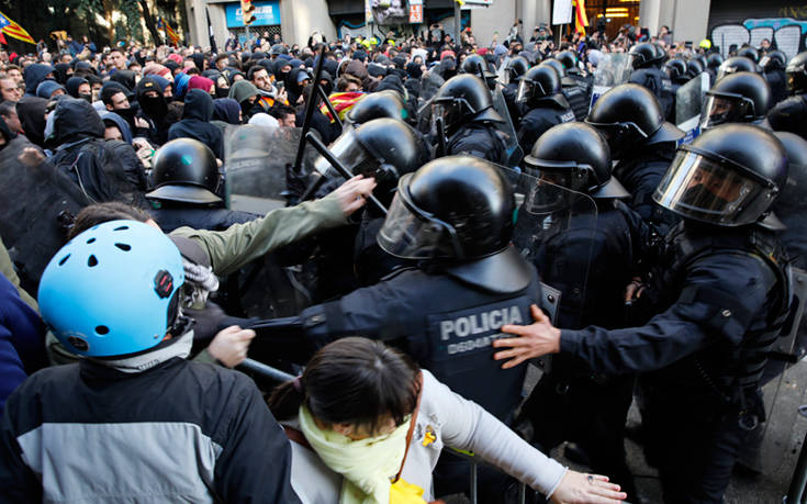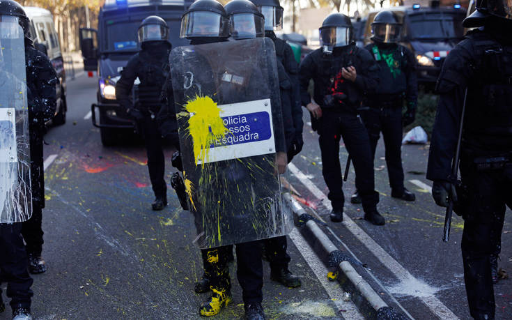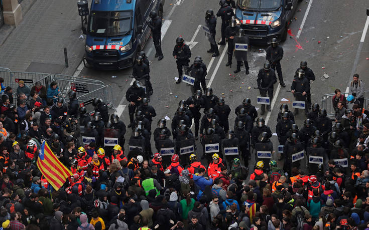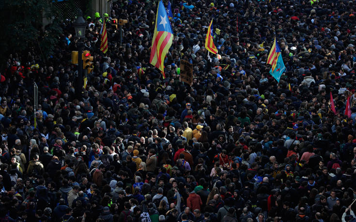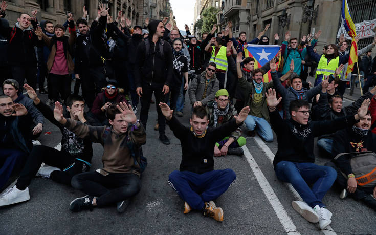 Οι υποστηρικτές της αυτονομίας της Καταλονίας χρησιμοποίησαν ελαστικά για να αποκλείσουν αυτοκινητόδρομους από νωρίς το πρωί και στη συνέχεια κατέκλυσαν κατά χιλιάδες τους δρόμους της πόλης, κρατώντας σημαίες της επαρχίας.