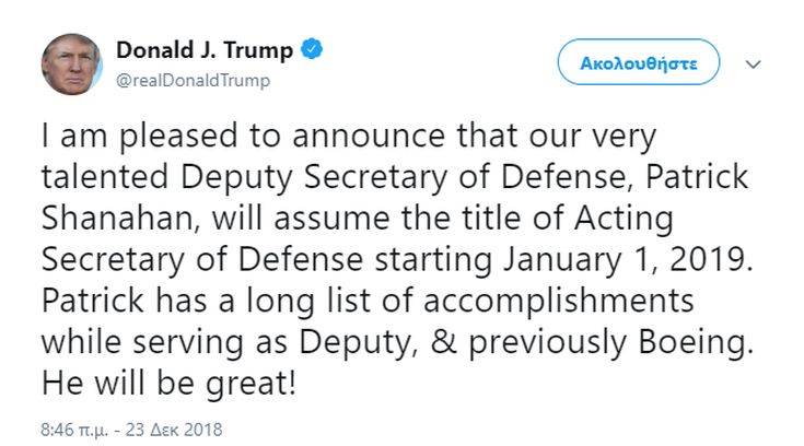 «Έχω τη χαρά να ανακοινώσω ότι ο πολύ ταλαντούχος αναπληρωτής υπουργός μας Άμυνας Πάτρικ Σάναχαν θα αναλάβει καθήκοντα προσωρινού υπουργού Άμυνας αρχής γενομένης της 1ης Ιανουαρίου» έγραψε στο Twitter.
