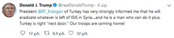«Ο πρόεδρος @RT_Erdogan της Τουρκίας μού έδωσε διαβεβαιώσεις με πολύ ισχυρές εκφράσεις ότι θα ξεριζώσει ό,τι απομένει από το Ισλαμικό Κράτος στην Συρία. Τα στρατεύματά μας επιστρέφουν στην πατρίδα!», έγραψε στο Twitter ο Τραμπ διευκρινίζοντας ότι είναι πεπεισμένος πως ο ομόλογός του είναι ικανός να τηρήσει τις δεσμεύσεις του.