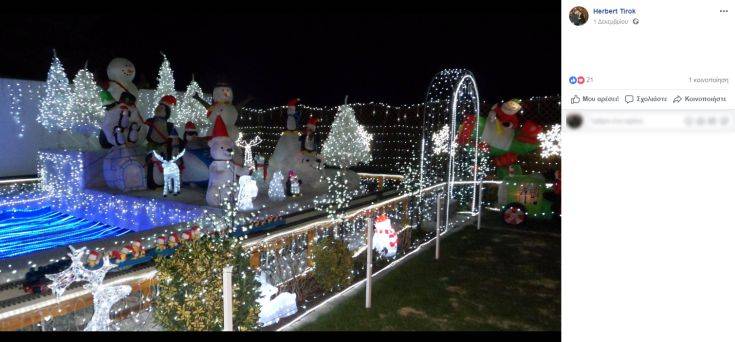 Ολόκληρη η κατοικία εξωτερικά, στο σύνολο της έκτασής του ο κήπος με κάθε δέντρο και όλους τους θάμνους και τα φυτά, αλλά και οι πολλές φάτνες σε διάφορα σημεία, η τρισδιάστατη αποτύπωση ενός τοπίου του βορείου πόλου και τα δύο τρενάκια που διασχίζουν τον κήπο, έχουν «στολιστεί» με τα δεκάδες χιλιάδες λαμπιόνια, επάνω σε καλωδιώσεις μήκους δέκα χιλιομέτρων, που τροφοδοτούνται από συνολικά 842 ρευματοδότες (πρίζες), όπως μεταδίδει ο ανταποκριτής του Αθηναϊκού Πρακτορείου Ειδήσεων.