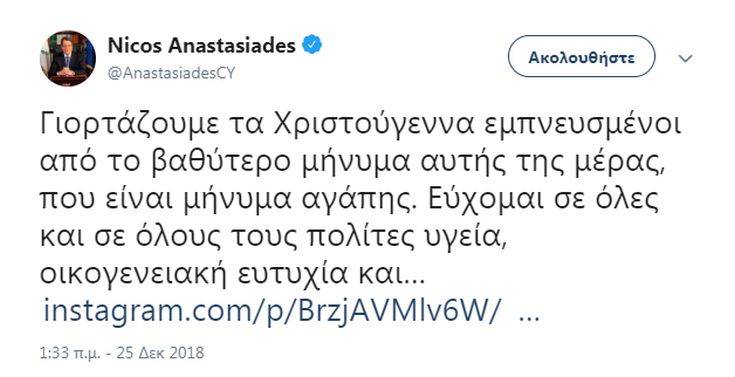 Ο Πρόεδρος της Κυπριακής Δημοκρατίας Νίκος Αναστασιάδης με ανάρτησή του στο Twitter εύχεται σε όλους υγεία, οικογενειακή ευτυχία και ευημερία.