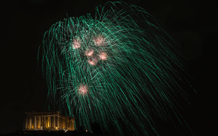 Πυροτεχνήματα εκρήγνυνται πάνω από τον αρχαίο ναό του Παρθενώνα, στην Ακρόπολη, κατά τη διάρκεια των εορτασμών για την αλλαγή του έτους στην Αθήνα.