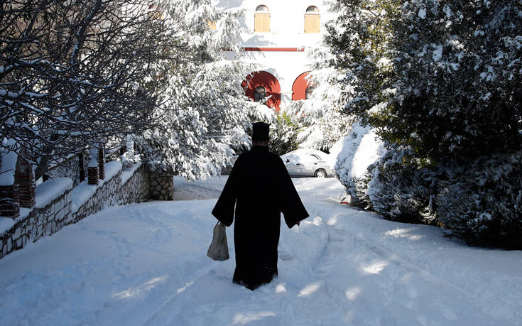Ένας ιερέας περπατά μέσα στο χιόνι για να φθάσει στο μοναστήρι της Πεντέλης, στην πρωτεύουσα, που την «χτύπησε» αρχές της εβδομάδας ο «Τηλέμαχος».