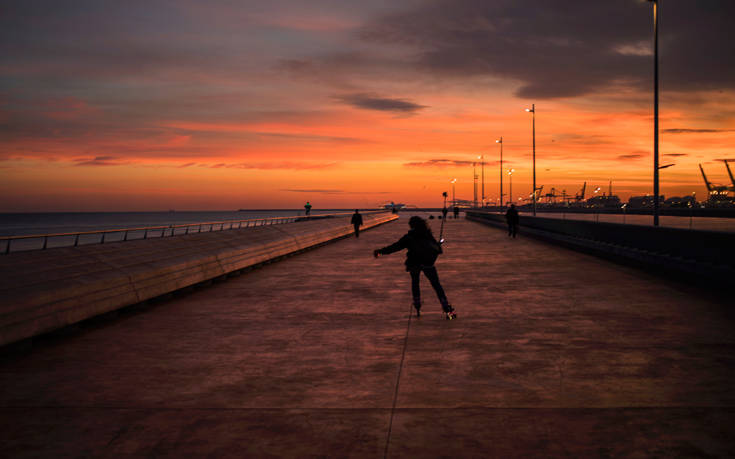Μια γυναίκα απολαμβάνει τη δύση στη Βαρκελώνη κάνοντας skate στο λιμάνι της πρωτεύουσας της Καταλονίας.
