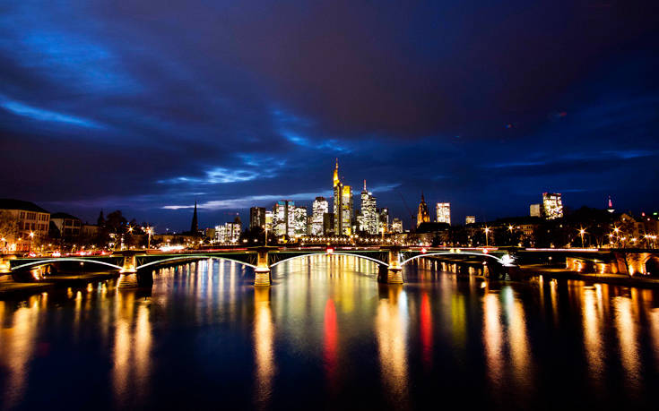 Πυκνά σύννεφα κρέμονται πάνω από την πόλη της Φρανκφούρτης, στη Γερμανία, σε μία μουντή βραδιά.