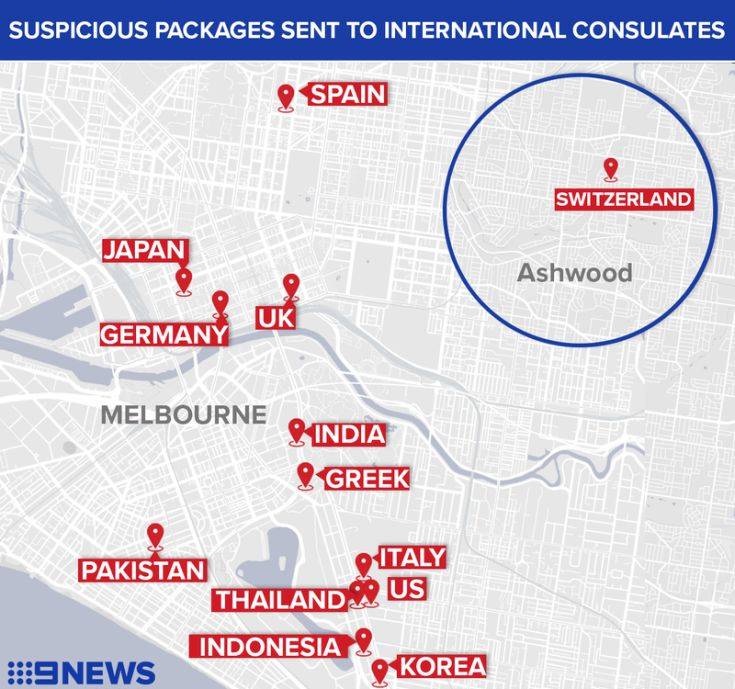 Σύμφωνα με μέσα ενημέρωσης, τα δέματα εστάλησαν σε τουλάχιστον εννέα ξένες αποστολές στη Μελβούρνη.