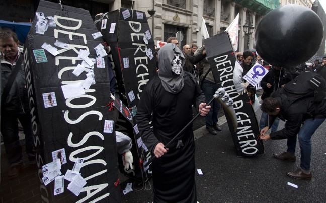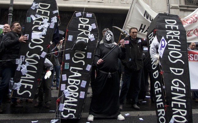 Στη συμβολική τους διαμαρτυρία εμφανίζονται να… κηδεύουν τα κοινωνικά τους δικαιώματα, αλλά και τα δικαιώματα κατά της ενδοοικογενειακής βίας, σε μία περίοδο που η Ισπανία πλήττεται από την ανεργία που ανέρχεται σε 25%.