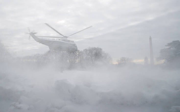 Ελικόπτερο μεταφέρει τον πρόεδρο των ΗΠΑ Ντόναλντ Τραμπ από τον Λευκό Οίκο, εν μέσω κακοκαιρίας.