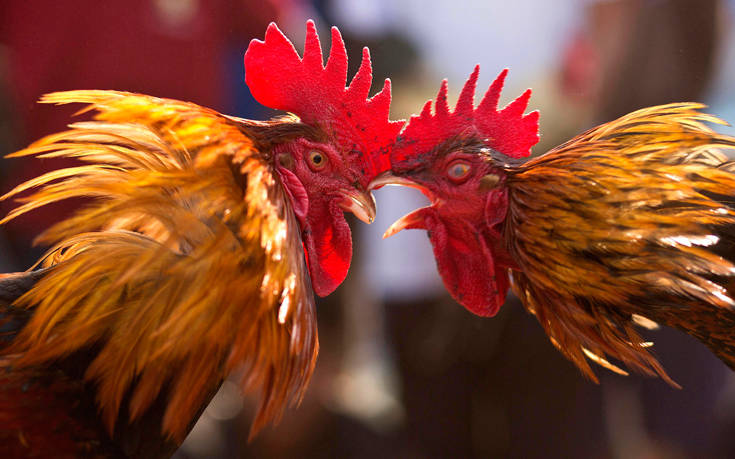 Δύο κόκορες λύνουν τις διαφορές τους κατά τη διάρκεια κοκορομαχίας ως μέρος του Φεστιβάλ Jonbeel, στο Τζαρκάντ της Ινδίας.