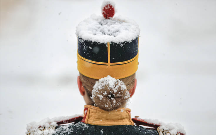 Το χιόνι ταλαιπωρεί μέλος της προεδρικής φρουράς της Ρουμανίας, πριν από την τελετή υποδοχής για τον πρόεδρο της Σλοβενίας Borut Pahor.