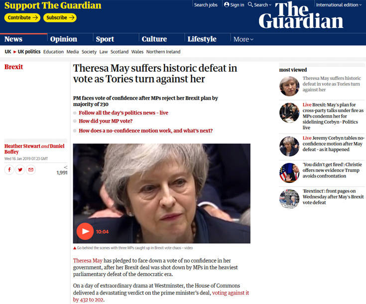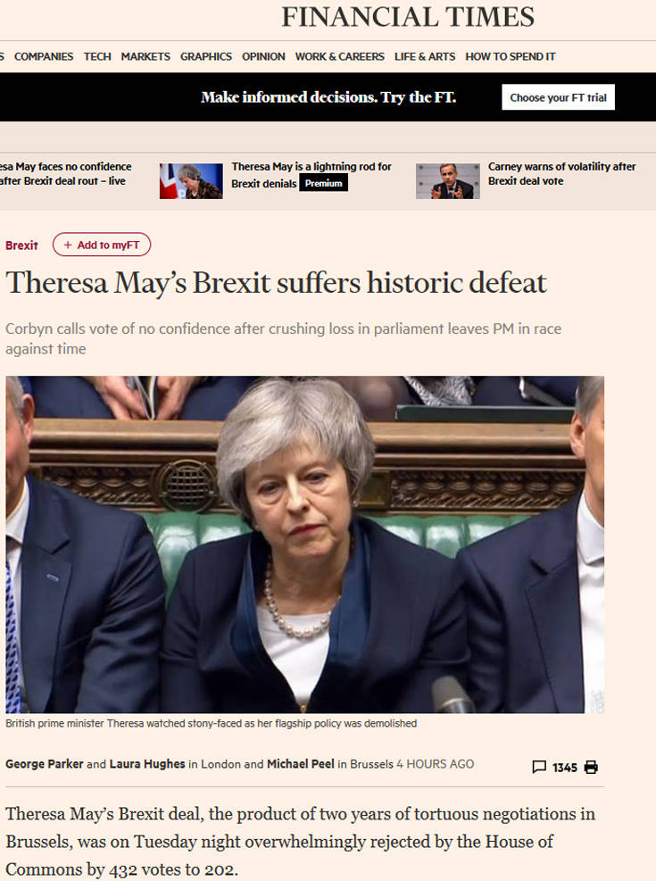 «Η συμφωνία της Μέι για το Brexit συνετρίβη από την Βουλή των Κοινοτήτων» γράφουν οι Financial Times. «Η συμφωνία της Τερέζα Μέι για το Brexit, προϊόν διετών βασανιστικών διαπραγματεύσεων στις Βρυξέλλες, απορρίφθηκε από την συντριπτική πλειοψηφία στην Βουλή των Κοινοτήτων».