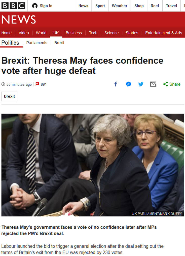 Για «τεράστια» ήττα της Τερέζα Μέι γράφει και το BBC, σημειώνοντας πως η πρωθυπουργός είναι σήμερα αντιμέτωπη με την πρόταση μομφής.