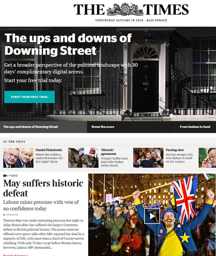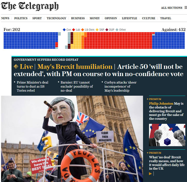 «Η Μέι υφίσταται ιστορική ήττα» είναι ο κεντρικός τίτλος των Times. «Η Τερέζα Μέι βρέθηκε υπό αυξανόμενη πίεση χθες την νύκτα να καθυστερήσει το Brexit μετά την μεγαλύτερη ήττα της πολιτικής ιστορίας στην Βουλή των Κοινοτήτων».