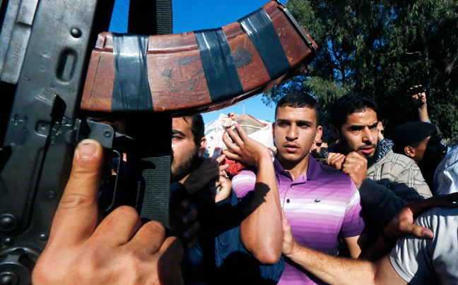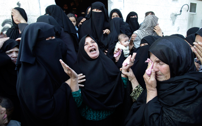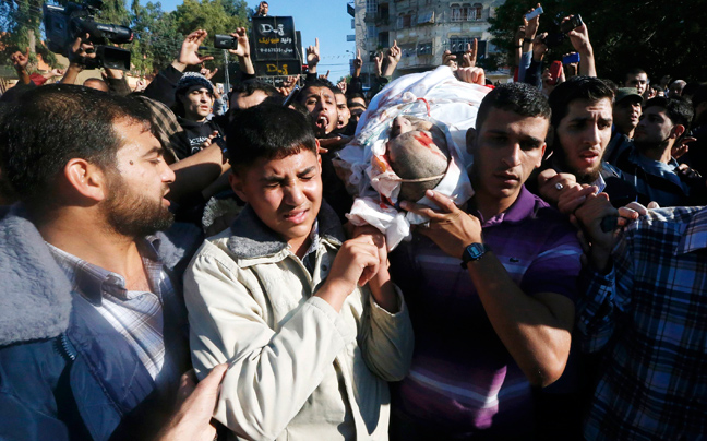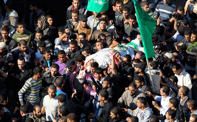 Χιλιάδες Παλαιστίνιοι συγκεντρώθηκαν στην πόλη της Γάζας για την κηδεία του επικεφαλής του στρατιωτικού σκέλους της Χαμάς Αχμέντ Τζαμπάρι, μετά τις επιθέσεις του Ισραήλ με ρουκέτες.