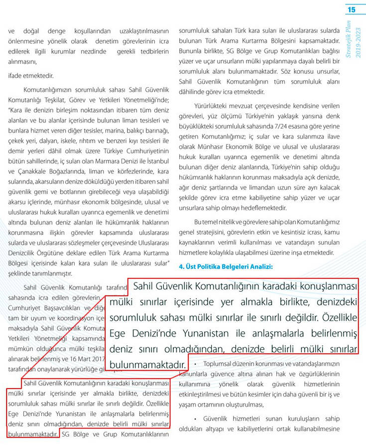 Συγκεκριμένα, στην 15η σελίδα αναφέρει πως: Οι επιχειρήσεις της Τουρκικής Ακτοφυλακής στη στεριά είναι μέσα από τα σύνορα, αλλά η περιοχή ευθύνης στη θάλασσα του Αιγαίου δεν περιορίζεται από χωρικά σύνορα. Ειδικότερα, από τη στιγμή που δεν υπάρχουν καθορισμένα -με συμφωνίες με την Ελλάδα- θαλάσσια σύνορα και δεν υπάρχουν όρια.