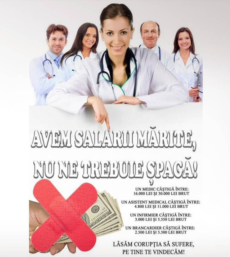 «Αφήνουμε τη δωροδοκία να υποφέρει και σας θεραπεύουμε», επισημαίνεται στο ίδιο μήνυμα, το οποίο προκάλεσε αντιδράσεις. Κάποιες αφίσες εξαφανίστηκαν από τα σημεία στα οποία είχαν αναρτηθεί, ωστόσο ο διευθυντής του νοσοκομείου, Κάταλιν Ροτέα, επισήμανε ότι θα αντικατασταθούν με άλλες που θα έχουν ακριβώς το ίδιο μήνυμα.