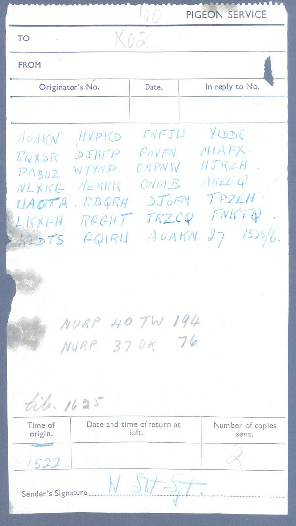 Μαζί με διάφορα σκουπίδια ο ιδιοκτήτης του σπιτιού βρήκε τα υπολείμματα του σκελετού του ταχυδρομικού περιστεριού. Στο πόδι του ήταν προσαρμοσμένη μία κόκκινη μεταλλική κάψουλα που περιείχε ένα σημείωμα σε λεπτό χαρτί με τίτλο «Pigeon Service» (Υπηρεσία Ταχυδρομικών Περιστεριών) και την αναγραφή 27 μπλοκ κωδικών.