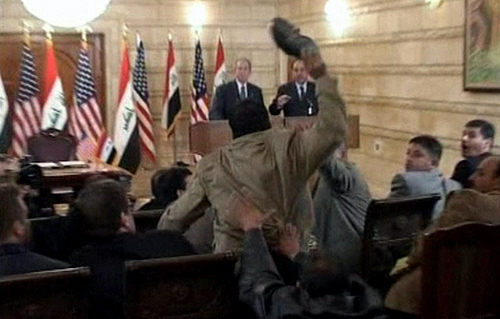 Το βίντεο με τον ιρακινό δημοσιογράφο Muntadhar al-Zeidi να εκτοξεύει το παπούτσι του κατά του προέδρου Μπους, στη διάρκεια συνέντευξης Τύπου, έκανε τον γύρο τηλεόρασης και διαδικτύου. Τα αστραπιαία αντανακλαστικά του προέδρου τον έσωσαν από το δερμάτινο βλήμα, το υλικό ωστόσο μετέτρεψε τον Al-Zeidi σε διασημότητα στη χώρα του και ταυτόχρονα σε παγκόσμιο σύμβολο του αντι-αμερικανικού αγώνα: με μια μόνο κίνηση, ο απλός καθημερινός άνθρωπος αψηφούσε το σύμβολο του «πλανητάρχη», καθώς στα ιρακινά πολιτισμικά έθιμα η πράξη του εκσφενδονισμού παπουτσιού εναντίον προσώπου θεωρείται βαριά προσβολή. Η φημολογία μάλιστα για την απαγωγή του Al-Zaidi και την κράτησή του από τις αμερικανικές δυνάμεις στο Ιράκ ενέτεινε τη συμβολική της κίνησης…