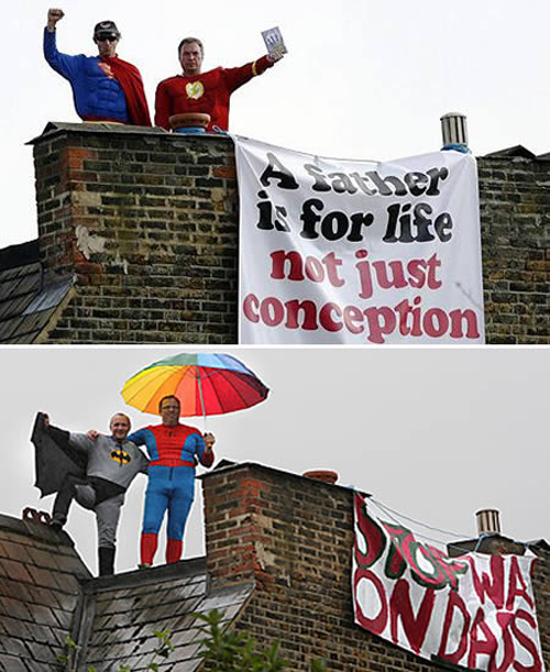Οι χωρισμένοι μπαμπάδες Jolly Stanesby και Eddie Goreckwi σκαρφάλωσαν στη στέγη του δικαστικού μεγάρου του Λονδίνου τον Οκτώβριο του 2003 για να διαμαρτυρηθούν για την κατάντια του πατέρα στις οικογενειακές δίκες. Ως μέλη της ομάδας ακτιβιστών πατεράδων «Fathers 4 Justice», οι δύο άντρες ήρθαν προετοιμασμένοι: διέθεταν όλα τα απαραίτητα για να περάσουν μια ολόκληρη βδομάδα στη σκεπή του μεγάρου. Τον επόμενο μήνα, έτερο μέλος της ομάδας «Fathers 4 Justice» σκαρφάλωσε σε γερανό, επίσης ντυμένος σαν υπερήρωας, για να διαμαρτυρηθεί για τη δικαστική απόφαση που του απαγόρευε να βλέπει την 3χρονη κόρη του. Η ομάδα έμελλε βέβαια να ξεφύγει στη δράση της, όταν το 2006 αποκαλύφθηκε ότι είχαν σκοπό να απαγάγουν τος 5χρονο γιο του τότε πρωθυπουργού της Βρετανίας Τόνι Μπλερ…