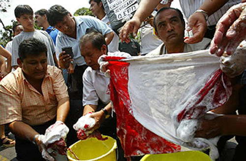 Για να διαμαρτυρηθούν για την επανεκλογή του προέδρου Alberto Fujimori το 2000, περουβιανές γυναίκες -και κατόπιν και άντρες- συγκεντρώνονταν κάθε μέρα στην κεντρική πλατεία της Λίμα για να ξεπλύνουν τη σημαία της χώρας από τις αμαυρώσεις της «βρόμικης» πολιτικής του. Η «μπουγάδα» της σημαίας συνεχίστηκε επί μήνες, ήταν ωστόσο βίντεο που τον παρουσίαζε να δωροδοκεί εισαγγελέα που τον ανάγκασε να εγκαταλείψει τη χώρα άρον-άρον και να καταφύγει στο Τόκιο. Το ταξίδι του στη Χιλή το 2005 θα τον οδηγούσε εντέλει στην έκδοσή του στο Περού, όπου και εκτίει πλέον πολυετή ποινή φυλάκισης…