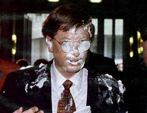 Παρόλο που δεν πρόκειται για τον πρώτο ισχυρό άντρα που δέχεται γλυκαντικές ουσίες στο πρόσωπο, η τούρτα που εκτοξεύτηκε στον τότε πρόεδρο της Microsoft ήταν ωστόσο ιδιαιτέρως θεαματική: ο Gates, που βρισκόταν στις Βρυξέλλες τον Φεβρουάριο του 1998 για επαγγελματικές συναντήσεις, δέχτηκε μια τούρτα στο πρόσωπο την ώρα που έμπαινε σε ένα κτίριο. Ο Gates δεν άσκησε δίωξη κατά των φαρσέρ, οι οποίοι δήλωσαν αργότερα ότι πρόθεσή τους ήταν να τον «γιαουρτώσουν» χωρίς να έχουν ιδιαίτερο λόγο. Το γεγονός ότι ήταν πρόεδρος της Microsoft έφτανε και περίσσευε…
