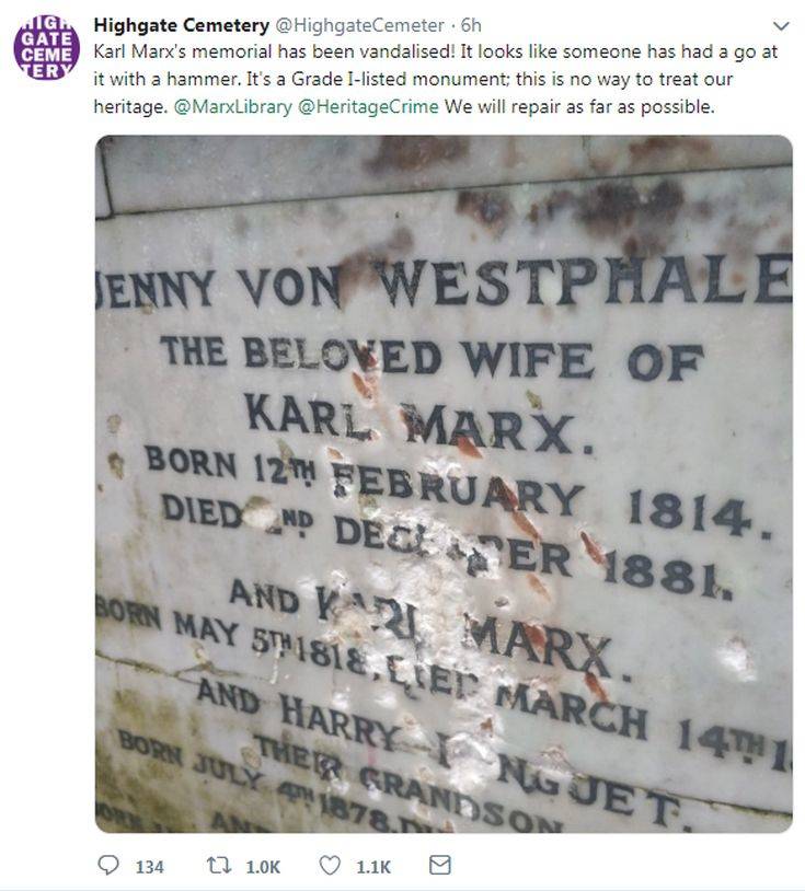 «Το μνημείο του Καρλ Μαρξ υπέστη βανδαλισμό! Φαίνεται πως κάποιος του επιτέθηκε με σφυρί. Είναι ένα μνημείο α’ βαθμού – δεν είναι τρόπος αυτός να συμπεριφερόμαστε στην κληρονομιά μας», αναφέρεται στην ανάρτηση του νεκροταφείου, που τονίζει πως το μνημείο θα επισκευαστεί το συντομότερο δυνατό.