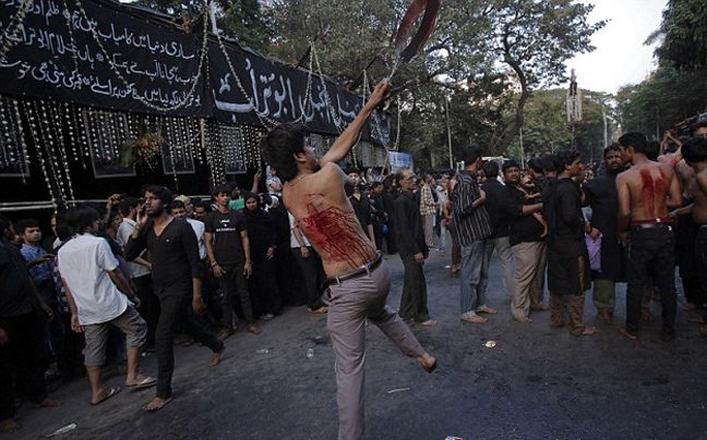 Μια μικρή λίμνη αίματος σχηματίζεται σταδιακά στο έδαφος τζαμιού στο Νέο Δελχί, καθώς σιίτες μουσουλμάνοι, μεταξύ των οποίων και παιδιά, αυτομαστιγώνονται στη διάρκεια ιερής τελετής.