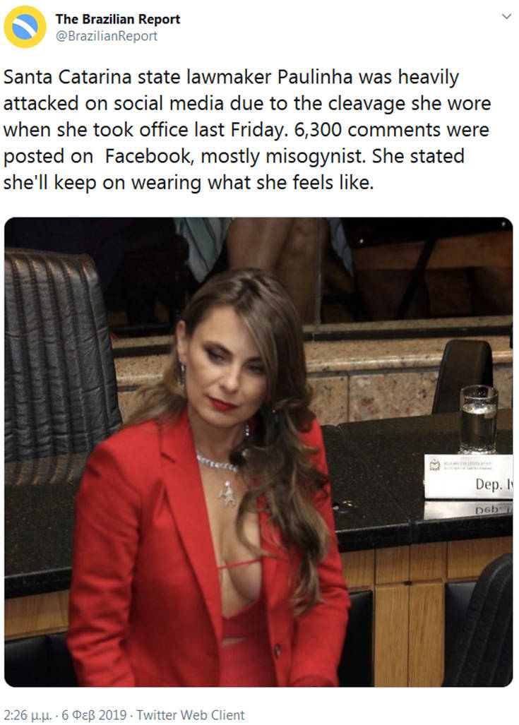 Οι πολιτικοί συνήθως κρίνονται από τις πράξεις τους παρά από τα ρούχα τους, ωστόσο μία βουλευτής στη Βραζιλία που έχει προκαλέσει αναστάτωση στα social media με τις στυλιστικές της επιλογές στην πρώτη εμφάνισή της στο Κοινοβούλιο, απειλεί με μηνύσεις όσους την «κακομεταχειρίστηκαν» στο διαδίκτυο για το ντύσιμό της.