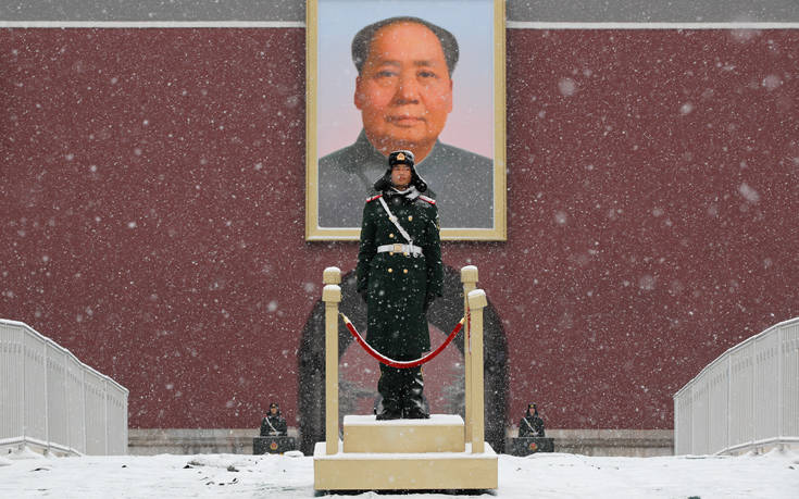 Στο χιονισμένο Πεκίνο ο φρουρός στέκεται αγέρωχος μπροστά από το μεγάλο πορτρέτο του Μάο Τσε Τουνγκ στην πλατεία Tiananmen.