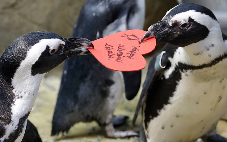 Πιγκουίνοι στη μάχη για έναν «βαλεντίνο» σε σχήμα καρδιάς που εκδίδεται από τον βιολόγο του ενυδρείου Piper Dwight, στο Σαν Φρανσίσκο των ΗΠΑ.