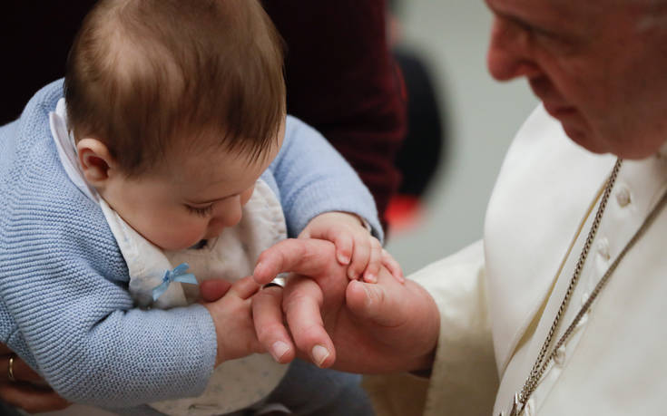 Ένα μωρό περιεργάζεται το δαχτυλίδι του Πάπα Φραγκίσκου στην αίθουσα του Πάπα Παύλου Β ‘στο Βατικανό.