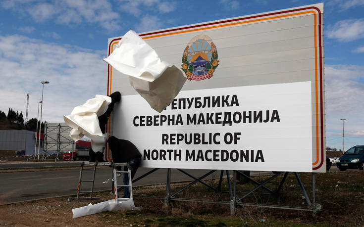 Εργάτες τοποθετούν στη μεγαλύτερη συνοριακή δίοδο της χώρας, στην Γευγελή, πινακίδα με το νέο όνομα της χώρας, «Δημοκρατία της Βόρειας Μακεδονίας».