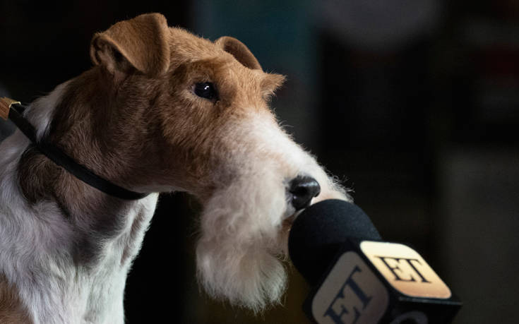 Ο «βασιλιάς», ένα terrier, στέκεται μπροστά από ένα μικρόφωνο κατά τη διάρκεια μίας παρουσίασης στη Νέα Υόρκη. Ο «βασιλιάς» κέρδισε ένα τουρνουά πριν λίγες ημέρες στο Westminster.