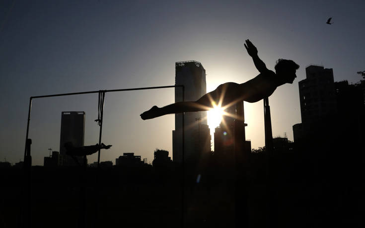 Αθλητής προπονείται στο παραδοσιακό άθλημα της Ινδίας, το Mallakhamb στο πάρκο Shivaji, στη Μουμπάι.