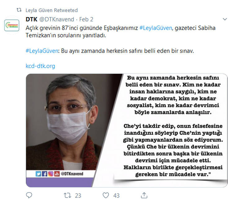 «Είμαστε εδώ για να ενώσουμε τις φωνές μας με αυτή της Λεϊλά Γκιουβέν, για να προσφέρουμε τις δυνάμεις μας στη μάχη της», δήλωσε ο συμπρόεδρος του HDP Σεζάι Τεμελί, όπως αναφέρει το Αθηναϊκό Πρακτορείο Ειδήσεων.