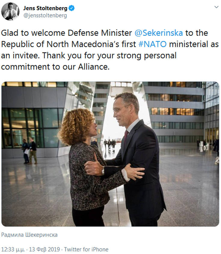 Ο κ. Στόλτενμπεργκ υποδέχτηκε με χειραψία στις Βρυξέλλες την υπουργό Άμυνας της γείτονος, Ραντμίλα Σεκέρινσκα, και ακολούθως έγραψε στο Twitter: «Χαρούμενος που καλωσορίζω την υπουργό Άμυνας Σεκέρινσκα στην πρώτη συμμετοχή της Δημοκρατίας της Βόρειας Μακεδονίας σε σύνοδο του ΝΑΤΟ ως προσκεκλημένη. Σας ευχαριστώ για την ισχυρή δέσμευσή σας στη Συμμαχία».
