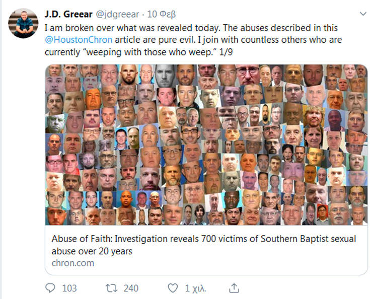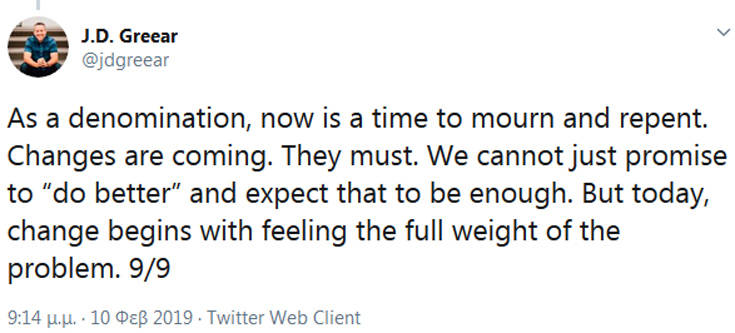 Αξιωματούχοι της Southern Baptist Convention παραδέχονται ότι ενδέχεται να υπάρχουν και άλλες υποθέσεις, ζητώντας από τα θύματα να μιλήσουν. «Είναι η ώρα του πένθους και της μεταμέλειας, όμως έρχονται αλλαγές», έγραψε στο Twitter ο πρόεδρος της Southern Baptist Convention Τζ. Ντ. Γκρίαρ.
