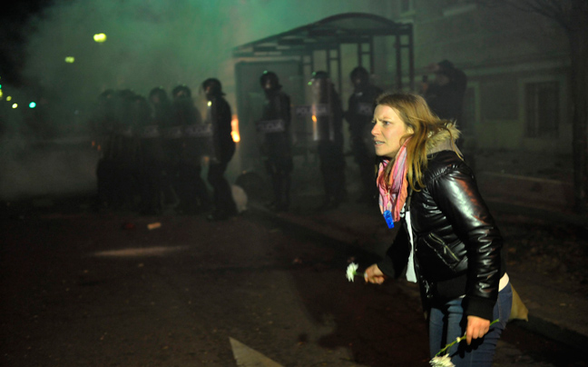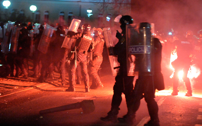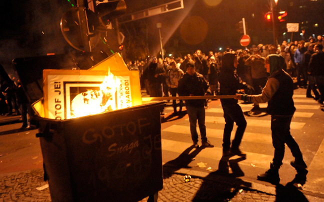 Η κατάσταση εκτροχιάστηκε γύρω στις 7 χθες το απόγευμα, όταν περίπου 10.000 διαδηλωτές κινήθηκαν προς το Δημαρχείο και άρχισαν να το «σφυροκοπούν» πετώντας πέτρες, μπουκάλια και άλλα αντικείμενα, ενώ η αστυνομία απαντούσε με δακρυγόνα.