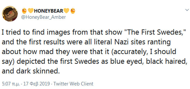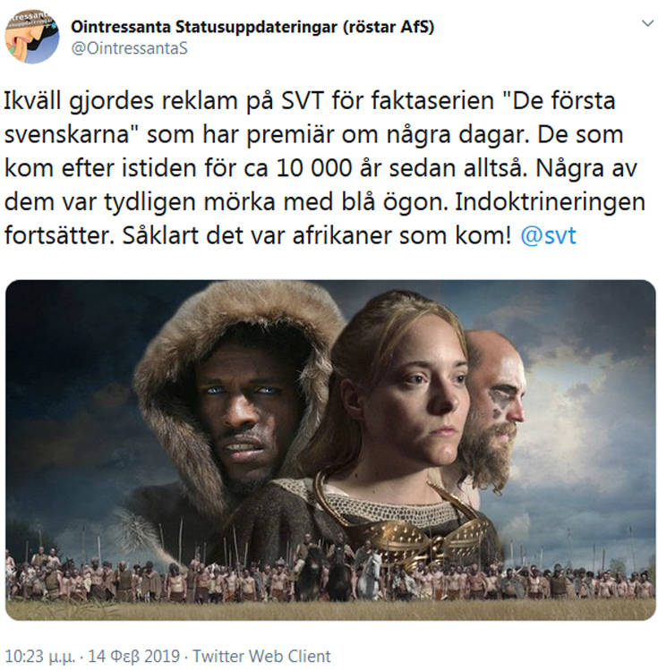 Η διαφήμιση για ένα ντοκιμαντέρ με τίτλο « Οι Πρώτοι Σουηδοί», που δείχνει τους προγόνους των σύγχρονων Σκανδιναβών ως μελαμψούς και με μπλε μάτια, έχει προκαλέσει ποικίλα σχόλια και αντιδράσεις στα social media.