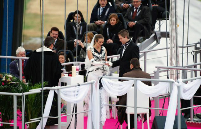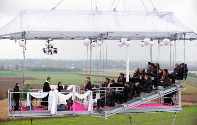 Παντρεύτηκαν πάνω σε μία πλατφόρμα 50μ. από το έδαφος μαζί με 20 περίπου καλεσμένους. Ενώ σε μία δεύτερη πλατφόρμα είχε στηθεί μία μπάντα και έπαιζε μουσική.