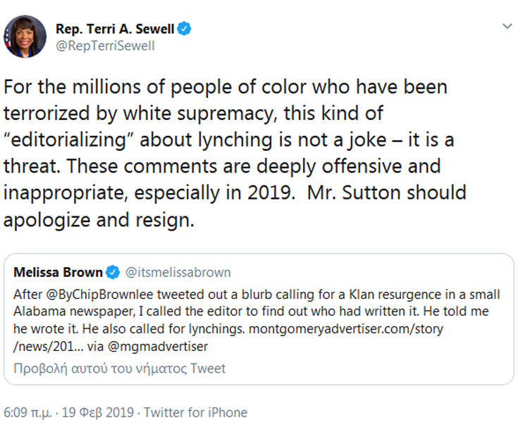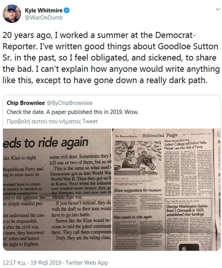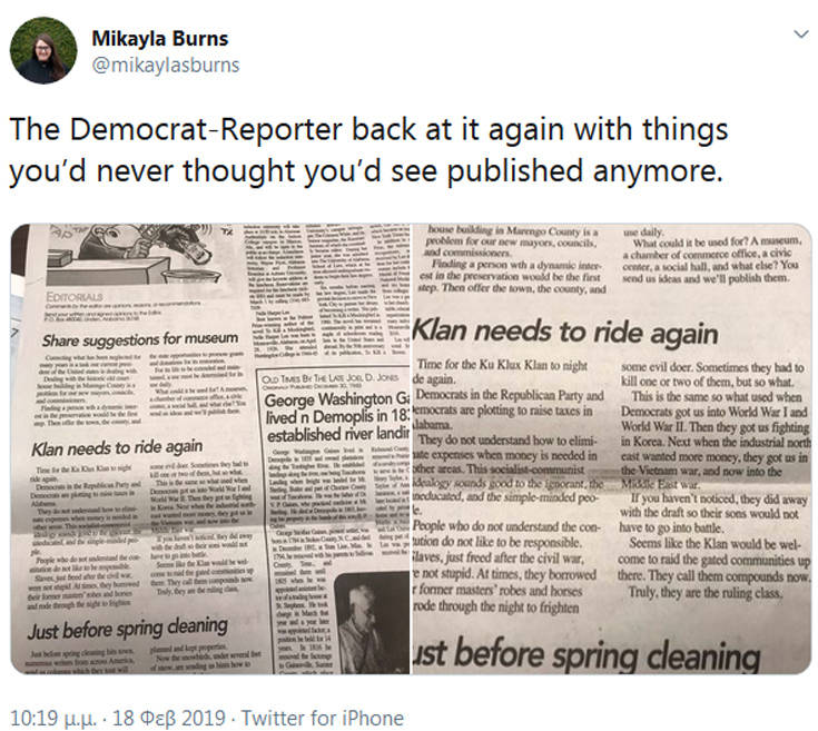 Ο διευθυντής και εκδότης μιας τοπικής εφημερίδας στην Αλαμπάμα των ΗΠΑ δέχεται πυρά για ένα άρθρο του με το οποίο καλεί την Κου Κλουξ Κλαν σε μαζικά λιντσαρίσματα. Συγκεκριμένα ζητάει από τη ρατσιστική οργάνωση να κάνει επιδρομή στην Ουάσινγκτον και να κρεμάσει τους Δημοκρατικούς, που θα αυξήσουν τους φόρους.