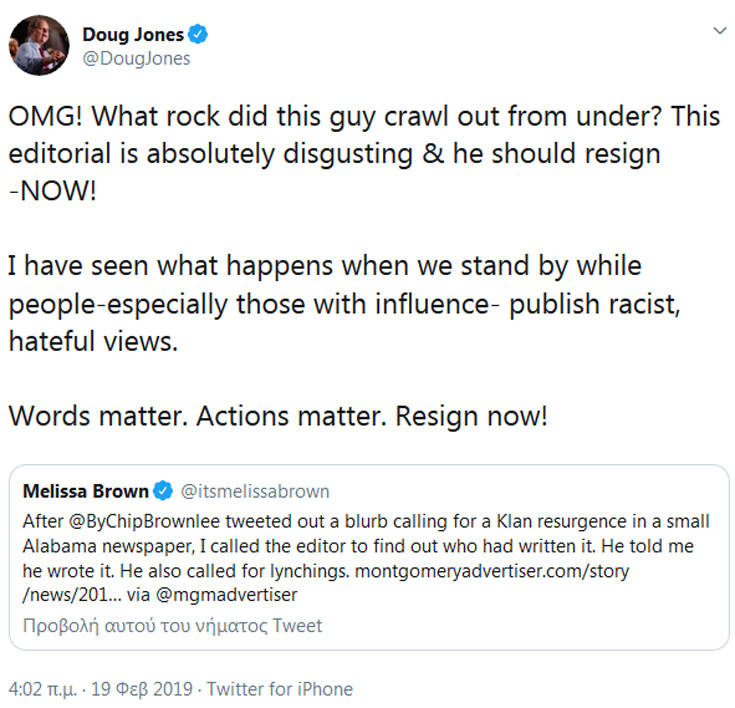 Από την πλευρά του ο Δημοκρατικός γερουσιαστής της Αλαμπάμα Νταγκ Τζόουνς, εξέφρασε το σοκ του για το «απολύτως απεχθές» άρθρο και τόνισε ότι ο Σάτον θα πρέπει να παραιτηθεί αμέσως.