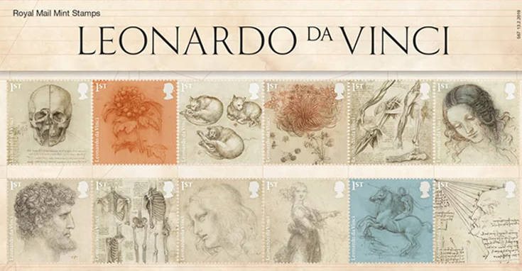 Δώδεκα από τα διαχρονικά σχέδια του Λεονάρντο ντα Βίντσι θα φτάνουν σε λίγο στα γραμματοκιβώτια σ’ όλη τη Βρετανία, χάρη στην ειδική έκδοση του Βασιλικού Ταχυδρομείου, που τιμά τα 500 χρόνια από τον θάνατο αυτής της μεγαλοφυΐας.
