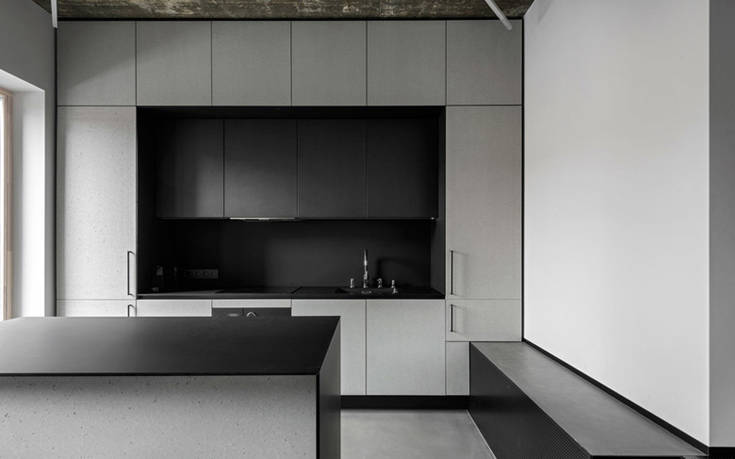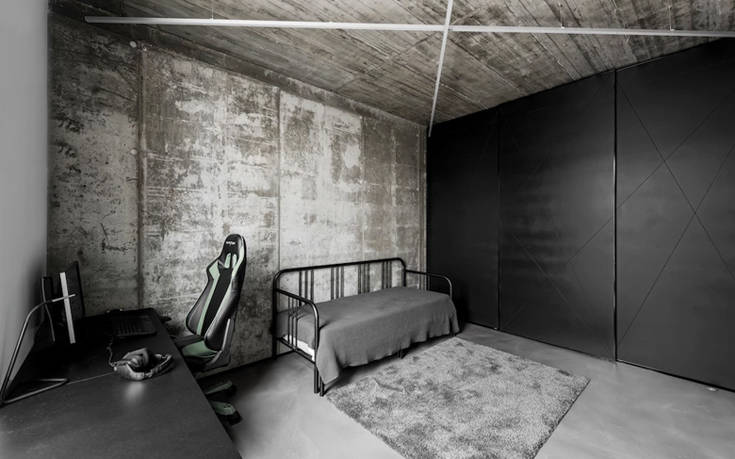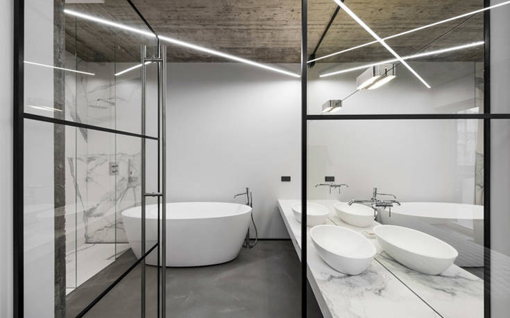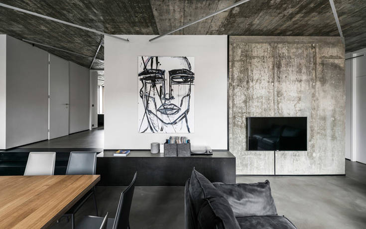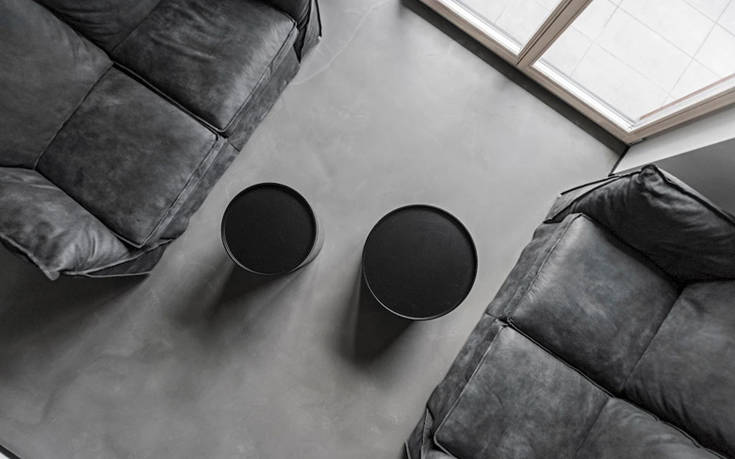 Υλικά αποκλειστικά μονοχρωματικά, τσιμέντο, μέταλλο, μάρμαρο και ξύλο όλα κι όλα, προκαλούν μια φιλόξενη αίσθηση, δίνοντας ταυτοχρόνως βάθος και συνέπεια στο εσωτερικό.